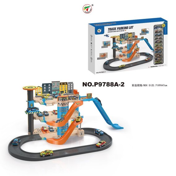 | Duży, solidnie wykonany parking samochodowy z dziesięcioma aluminiowymi pojazdami i helikopterem w zestawie, to propozycja dla dzieci od trzeciego roku życia. Parking składa się z 4 poziomów. Na górnym poziomie znajduje się lotnisko dla helikoptera. Niżej mamy miejsca postojowe i zjazd dla samochodzików zjeżdżalnią na sam dół. Na drugim piętrze umiejscowiono miejsca parkingowe i zjazd na najniższy poziom. Na dole znajduje się myjnia, stacja benzynowa oraz ruchoma platforma konserwacyjna . Na każdy z poziomów możemy się dostać za pomocą windy- podnośnika. Winda nie wymaga użycia baterii, sterujemy nią ręcznie. Funkcje parkingu: