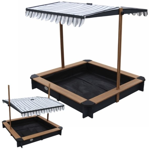 - Regulowany daszek 2w1 - wykonany z wodoodpornego poliestru (280 g/m²) z ochroną UV50, który chroni dzieci przed słońcem i deszczem. Można go łatwo regulować, dostosowując kąt nachylenia, a po zakończeniu zabawy - opuścić, zamieniając go w ochronną pokrywę piaskownicy.