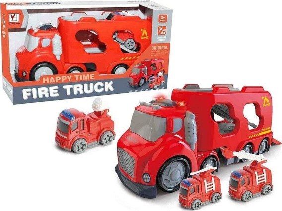 Auto z kontenerem i 2 autkami straży pożarnej