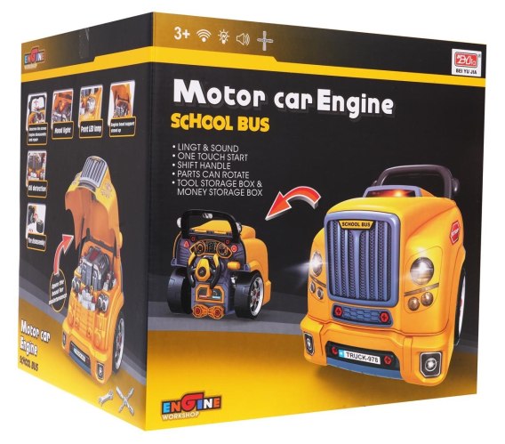 Interaktywna zabawka, przód żółtego autobusu szkolnego z podnoszoną maską oraz deską rozdzielczą przeznaczony dla dzieci od 3-go roku życia. Komplet zawiera części do złożenia przodu autobusu oraz narzędzia potrzebne w montażu i demontażu części takie jak śrubokręt, czy klucze. Pod maską autobusu znajduje się duży rozkręcany silnik, który dziecko może rozłożyć na czynniki pierwsze. Do wymiany nadają się także świece zapłonowe oraz koła. Na desce rozdzielczej znajduje się przycisk startu pojazdu z odgłosami zapalania silnika, kierownica z klaksonem oraz sygnalizator awaryjny. Pod kierownicą umiejscowiony jest schowek, do którego można włożyć wszystkie niezbędne narzędzia, śruby, pokrętła. Zabawka posiada wygodną rączkę do przenoszenia. Zasilanie bateriami typu 3 x AA 1,5 V (brak w zestawie). Zabawka dla małego mechanika rozwija umiejętności manualne, małą motorykę oraz koordynację oko-ręka.