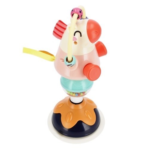 KONIK na PRZYSSAWKĘ Bam Bam to zabawka edukacyjna przeznaczona dla maluchów od 6 m-ca. Postać uroczego konika osadzona jest na obracającej się, dwukolorowej platformie. W wyniku obrotu platforma wydaje delikatne, turkocząco- grzechoczące dźwięki, w tym dzięki kolorowym kuleczkom umieszonym w kuli, na której stoi konik. Nad zabawną postacią zwierzątka umieszczona jest obręcz z kolorowymi kuleczkami, których obracanie i przeciąganie z jednego końca na drugi doskonale ćwiczy zdolności manualne dziecka. Subtelna i zróżnicowana kolorystyka absorbuje uwagę dziecka aktywizując jego zmysły wzroku, dotyku, słuchu. Przyssawka osadzona pod zabawką zapewnia stabilne mocowanie do blatu stolika, tacki wózka czy krzeska do karmienia. Wymiary/waga/baterie: wymiary produktu (szer. x wys.)[cm]: 7x21, wymiary opakowania (dł. x wys. x gł.)[cm]: 14x26x12, waga produktu bez opakowania [kg]: 0,16 kg, waga produktu w opakowaniu [kg]: 0,23 kg, nie wymaga zasilania bateriami. Zabawka przeznaczona dla dzieci w wieku: 6m+. Pakowana w otwarty kartonik.