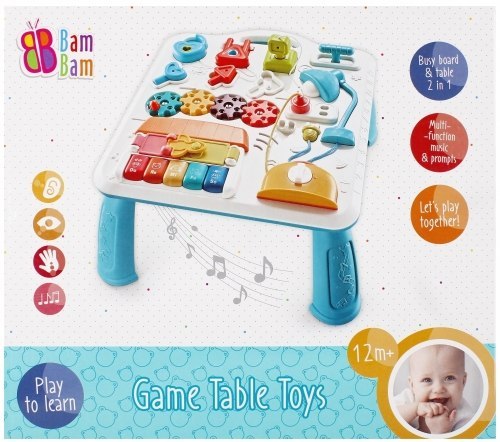 Interaktywny Muzyczny STOLICZEK EDUKACYJNY, zabawka spełniająca funkcję- edukacyjną, melodyjną i naukową, na każdy etap rozwoju dziecka. Zróżnicowana faktura i materiały, w tym ruchome elementy oraz mrugające przyciski, małe pianinko wygrywające różne melodie, muzyczne elementy ukrywające przeróżne odgłosy czy melodyjki ,dostarczają szeregu bodźców, aktywizując wszechstronny rozwój dziecka, począwszy od zmysłów poprzez zdolności manualne, motoryczne oraz percepcję i wyobraźnię Stolik muzyczny posiada wiele możliwości zabawy tj.: poznawanie odgłosów zwierzątek, zdolności ruchowe poprzez elementy ruchome umieszczone na blacie stoliczka, umiejętność dopasowywania odpowiednich kształtów. Wymiary/waga/baterie: wymiary produktu (dł. x wys. x gł.)[cm]:39x24x39, wymiary opakowania (dł. x wys. x gł.)[cm]: 40x35x9, waga produktu bez opakowania [kg]:1,01 kg, waga produktu w opakowaniu [kg]: 1,24 kg. Zabawka przeznaczona dla dzieci w wieku: 12M+. Wymaga zasilania bateriami 3x AALR06- załączone do zestawu. Zestaw pakowany w kartonik.