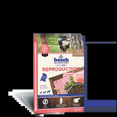 BOSCH Reproduction, to karma stworzona specjalnie z myślą o sukach w oraz po ciąży a także w okresie laktacji. W brzuchu matki dostarczane są im wszelkie niezbędne dla prawidłowego rozwoju składniki odżywcze. Podając więc suczce karmę BOSCH Reproduction zapewniasz długotrwałe zdrowie jednocześnie samicy i jej potomstwu. Wyjątkowa formuła wraz ze starannie wyselekcjonowanymi składnikami gwarantuje zdrowie matki w okresie ciąży oraz prawidłowy rozwój płodu. Zbilansowana receptura zapewnia wytwarzanie wartościowego mleka przez samicę, które będzie gwarancją doskonałego samopoczucia szczeniaka.