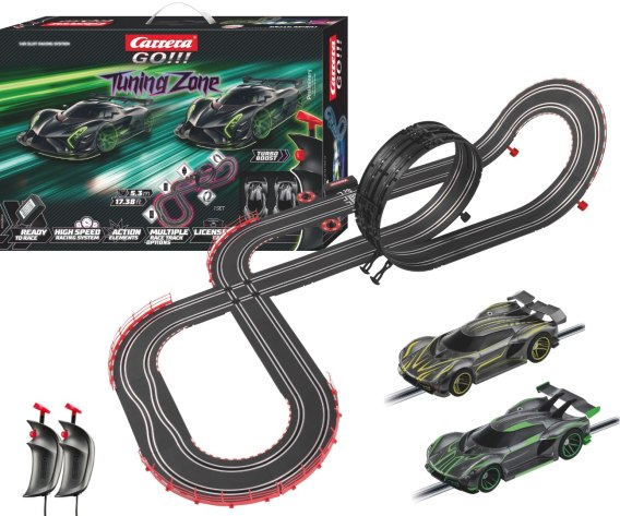 Zestaw "Carrera GO!!! Tuning Zone" łączy ekscytujące wyścigi z kreatywnymi możliwościami. Hipersamochody w skali 1:43 zachwycają futurystycznym designem, który przypomina estetykę nowoczesnych samochodów przyszłości. Ich dynamiczny kształt i stylowe detale sprawiają, że przyciągają wzrok i stanowią atrakcję świata Carrera. Tor o długości 5,3 metra oferuje mnóstwo różnorodności i emocji dzięki takim elementom jak pętla, skrzyżowanie i zwężenie.