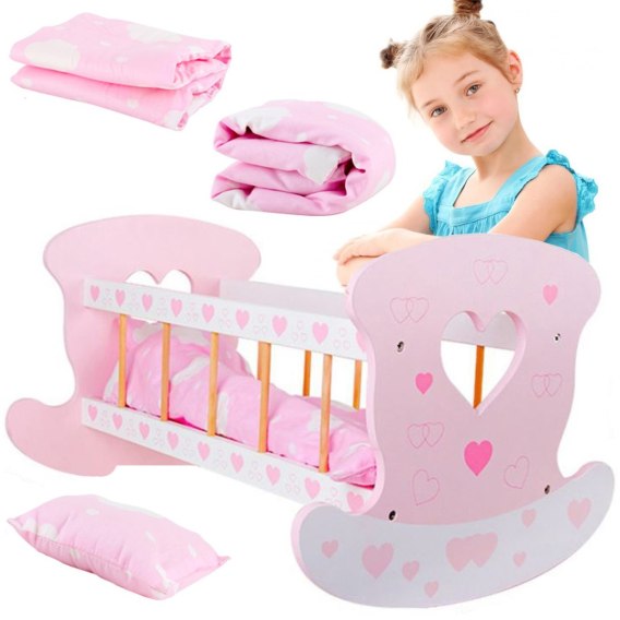 W komplecie znajduje się piękna, dopasowana pościel w delikatnym różowym kolorze, dzięki której każda lalka zostanie wygodnie ukołyszana do snu. Wszystkie elementy wykonane są z drewna, które zostało pokryte bezpiecznym lakierem i pomalowane nietoksycznymi farbami w pastelowych kolorach, które zaspokoją gusta każdego malucha i sprawią mnóstwo radości podczas zabawy.