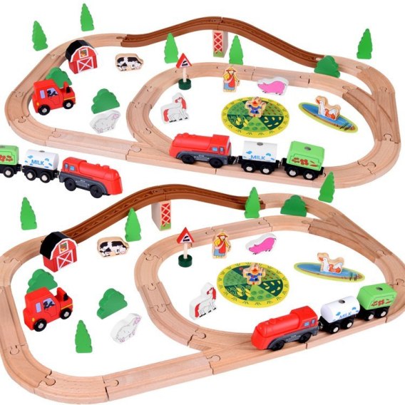 Zestaw składa się z 50 elementów, z których można złożyć tory dla pociągu z wagonami. Zestaw wykonany z wysokiej jakości drewna w atrakcyjnych kolorach i wzorach. Drewniane zabawki zostały pokryte bezpieczną farbą, tory są w naturalnym kolorze. Elementy toru są drewniane z wyjątkiem wiaduktu, który wykonany jest z tworzywa sztucznego. Lokomotywa na baterie (zasilana baterią 1,5 V AAA- brak w zestawie) płynnie porusza się po torach, w trakcie jazdy świeci świtałem, dostarczając niezapomnianych wrażeń i rozwijając wyobraźnię dziecka.