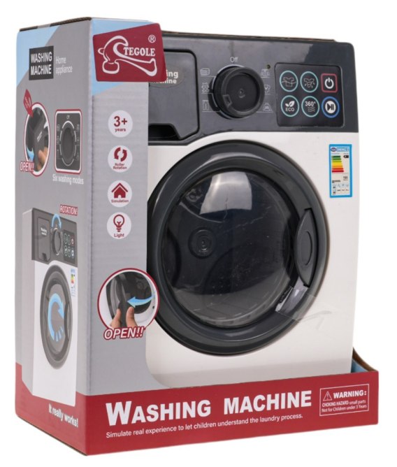 Interaktywna pralka z efektami dźwięku i światła dla dzieci od 3-go roku życia. Pralka, nie tylko przypomina prawdziwą, ale również skutecznie ją naśladuje. Drzwiczki pralki otwierają się i zamykają, bęben się obraca. Możemy włożyć do pralki np. ubranko dla lalki, ale uwaga nie wlewamy wody. W górnej części pralki znajduje się panel do obsługi pralki. Pralkę uruchamiamy czerwonym przyciskiem, możemy zmieniać dowolnie programy prania, przyciskami i pokrętłem. Każdy program prania wydaje inne dźwięki. W górnym lewym rogu pralki znajduje się wysuwana szufladka na „proszek". Zabawka zasilana jest bateriami typu 3 X AA 1,5 V (brak w zestawie).