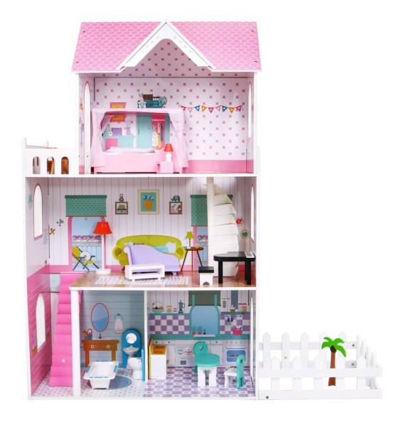 Mega duży drewniany domek dla lalek z wyposażeniem i ogródkiem, to propozycja dla dzieci już od 3-go roku życia. Znakomicie wykonany, bogato wyposażona, będzie spełnieniem marzeń Twojej pociechy. Proponowany domek wykonany została z wysokiej jakości drewna, solidnego i trwałego materiału, jest stabilny i odporny na uszkodzenia zewnętrzne. Drewniany domek oraz jego drewniane elementy wyposażenia pomalowane zostały bezpiecznymi, nietoksycznymi farbami. Delikatne pastelowe kolory domku oraz wyposażenia to niebywały atut tego zestawu. Domek posłuży Twojej pociesze przez długie lata. Zabawa w domek uczy kreatywności, rozwija wyobraźnię, pozytywnie wpływa na rozwój Twojej pociechy a przy tym dostarcza wiele pozytywnych emocji i wrażeń.