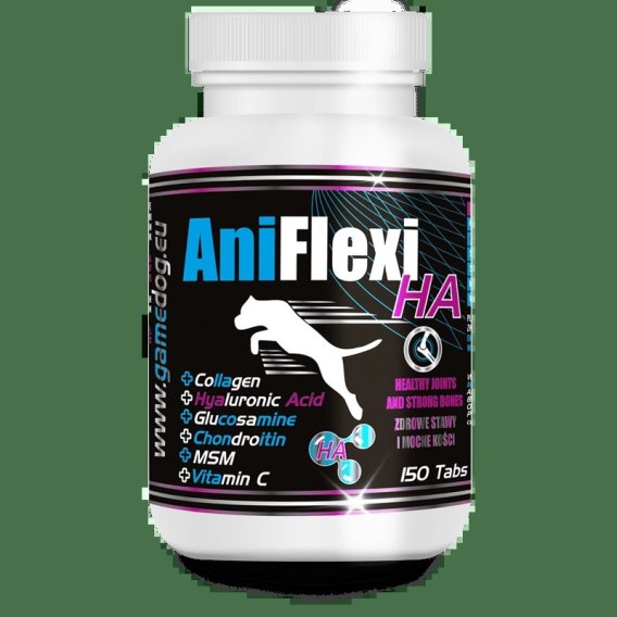 Game Dog AniFlexi HA 150 tabletek to suplement diety wspomagający prawidłową pracę układu ruchu u psów. Preparat pomaga w leczeniu i profilaktyce chorób stawów, łagodzi stany zapalne oraz ogranicza dolegliwości bólowe. Wzmacnia i regeneruje tkanki chrzęstne, poprawia ruchomość stawów oraz elastyczność chrząstek. Regularne stosowanie wspiera zwierzęta z dysplazją, zwyrodnieniami stawów i kręgosłupa, a także szczenięta z zaburzeniami rozwoju chrząstek stawowych. Suplement polecany jest również psom z zapadaniem tchawicy oraz problemami w obrębie krtani.
