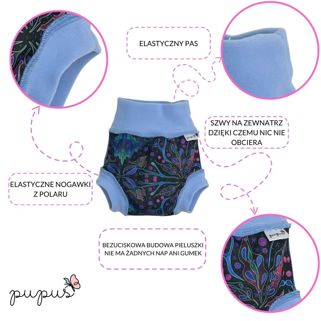 Nasze gatki są uszyte z miękkiego, elastycznego pulu oraz dwustronnych pasów polarowych.