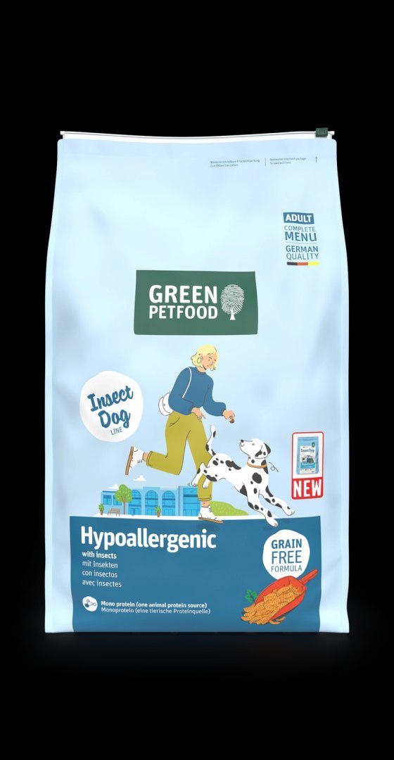 Green Petfood Hypoallergenic with Insects to hipoalergiczna karma dla psów, stworzona z myślą o zwierzętach z nietolerancjami pokarmowymi lub alergiami. Zawiera owady jako monoproteinę zwierzęcą, co jest rzadko wykorzystywanym źródłem białka, idealnym dla psów cierpiących na alergie pokarmowe. Bezzbożowa receptura została wzbogacona o cenne kwasy tłuszczowe, witaminy, cynk i miedź, które wspomagają zdrową skórę i lśniącą sierść.