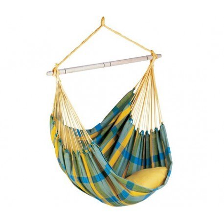 HUŚTAWKA/WISZĄCY FOTEL BRASIL - AMAZONAS Ten wspaniały wiszący fotel pochodzi z Brazylii, ojczyzny sjesty i celebrowania wypoczynku. Delikatne kołysanie przeniesie Cię na niebiańskie plaże i bajeczne wyspy, pozwoli zrelaksować się i odpocząć. AMAZONAS Amazonas Hängematten GmbH to Niemiecka firma produkująca oryginalne Brazylijskie hamaki, huśtawki, nosidełka oraz stojaki już od 1995 roku. Posiada własny zakład produkcyjny w północno-wschodniej Brazylii, który jest światowej sławy centrum produkcji hamaków. Od wielu lat hamaki AMAZONAS są ręcznie robione w tradycyjny sposób przez rdzennych Brazylijczyków. Bazując na doświadczeniu i staranności wykonania, otrzymujemy produkty o najwyższej jakości i w unikalnych wzorach. Charakterystyka bardzo estetyczny niezwykle miły, komfortowy i wytrzymały materiał wysoka jakość wykonania prawie tak duży jak klasyczny brazylijski hamak zawieszony na drewnianym drążku o długości 1,10m i grubości 44mm drążek wykonany przy użyciu opatentowanej technologii Drexelung ( końce są lżejsze od środka) konstrukcja zapewnia stabilny naciąg lin oraz zapobiega ich ześlizgiwaniu się w kierunku środka materiał o gramaturze 400g/m2 wykończony poczwórnym szwem poduszki NIE są częścią zestawu Zastosowanie wiszący fotel do salonu (mocowanie na haku Power Hook lub na jednym ze stojaków Amazonas) fotel do karmienia (mocowanie Power Hook lub stojak Luna lub Palmera) huśtawka ogrodowa lub na taras / balkon fotel wiszący do powieszenia na drzewie (za pomocą liny Smartrope) Akcesoria do zawieszenia huśtawki oraz stojaki dostępne są w naszym sklepie (nie są w zestawie z huśtawką) Dane techniczne powierzchnia siedzenia: około 160 x 130 cm waga produktu: około 2,7 kg maksymalne obciążenie: około 150kg materiał: 85% bawełna, 15% poliester materiał o gramaturze 400g/m2 Dla większego bezpieczeństwa : Zawsze zawieszaj sznurki huśtawki w wewnętrznych zagłębieniach drążka, a linki, na których fotel wisi w zewnętrznych zagłębieniach. Polecane sposoby montażu stojak Luna oraz stojak Palmera ( do kupienia w naszym sklepie) za pomocą haka Power Hook (do kupienia w naszym sklepie) za pomocą liny Smartrope do wieszania hamaków na drzewach ( do kupienia w naszym sklepie) AZ-2030240
