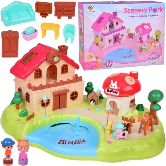 Zestaw przedstawia kolorową scenerię z uroczym, otwieranym domkiem, sklepikiem w kształcie grzyba oraz placem zabaw otoczonym drzewami, grządką z marchewką i innymi uroczymi szczegółami. Zabawka wyposażona została także w efekty dźwiękowe i świetlne, które zapewne urozmaicą zabawę.