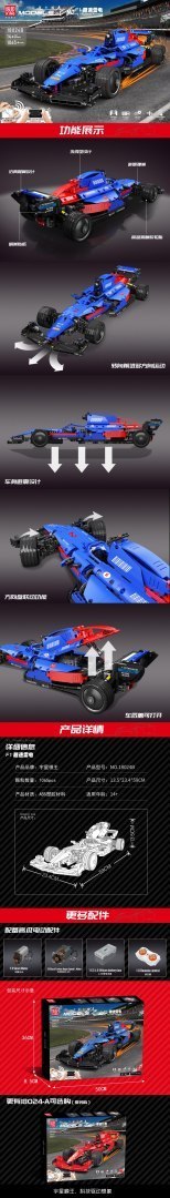 Wysokiej jakości klocki konstrukcyjne dla dzieci od czternastego roku życia. Zestaw składa się z 1065 elementów, z których zbudować można zdalnie sterowany Bolid F1. Pojazd jeździ we wszystkich kierunkach do przodu, do tyłu w prawo i w lewo. Sterować go można za pomocą pilota dołączonego do zestawu lub przy pomocy aplikacji w telefonie. Aplikację można pobrać skanując kod QR znajdujący się na opakowaniu. Dzięki aplikacji można nie tylko poruszać pojazdem, ale również zaprojektować jego ruchy. Posiada gumowe opony, które zapewniają mu dobrą przyczepność do podłoża. Auto zasilane jest akumulatorem 7,4V (znajduje się w zestawie), pilot bateriami typu 2 x AAA 1,5V (brak w zestawie).