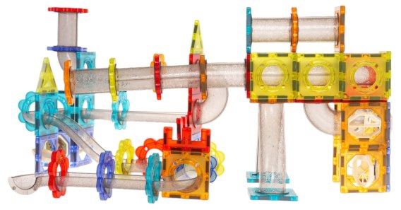 Zestaw kolorowych klocków magnetycznych dla dzieci od 3-go roku życia. Zestaw składa się z 176 elementów i pozwala na zbudowanie toru dla kulek o dowolnym układzie. Niektóre elementy zestawu zasilane są bateriami, a po włączeniu ich rozświetlają tor pulsującymi światłami, a zabawa robi się ciekawsza. Światełka pulsują w 3 trybach: szybkim, średnio szybkim i wolnym, można wybrać, który tryb będzie dla dziecka odpowiedni. Dodatkowo kilka kulek po potrząśnięciu mruga światełkami. W zestawie mamy też kilka kolorowych kapsuł, które świecą się i zmieniają kolory oraz kilka reflektorów LED. W sumie zestaw zasilany jest bateriami typu 12 x LR1130, 6 x LR41 oraz 8 x CR1220. Wszystkie baterie znajdują się w zestawie. Klocki wykonane zostały z najlepszej jakości tworzywa, są gładkie i starannie wykonane. Łączymy je ze sobą za pomocą wbudowanych magnesów. Magnesy bardzo dobrze trzymają, zapewniając stabilność konstrukcji. W zestawie znajduje się obrazkowa instrukcja złożenia przykładowych torów.