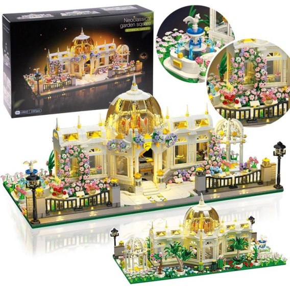 Klocki konstrukcyjne seria: ogród botaniczny, techniczne, duży zestaw klocków, zamek, pałac z klocków, neoklasyczny pałac ogrodowy, kwiaty, kwiatki, palma, fontanna, fortepian, kopuła, dużo szczegółów, efekt świetlny