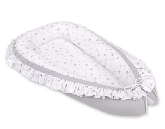 Kokon/kojec niemowlęcy z falbanką - mini gwiazdki szare na białym tle/szary