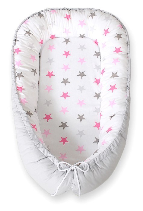 Kokon niemowlęcy dwustronny kojec otulacz Premium BOBONO- gwiazdy różowo-szare/szary