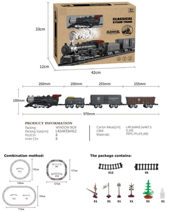Kolejka Retro z Funkcją Świateł, Dźwięku i Dymu 172cm