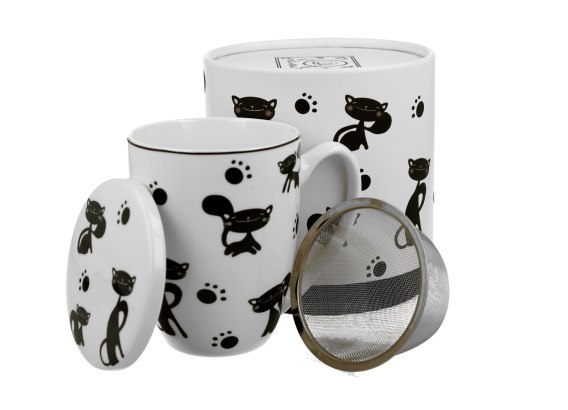 Kubek 350 ml z zaparzaczem KOTY CZARNE w opakowaniu w kształcie tuby, wchodzący w skład serii ANIMALS, wykonany z porcelany New Bone China, która charakteryzuje się naturalnym kremowo-białym kolorem z delikatnym połyskiem oraz wyjątkową wytrzymałością i trwałością, zachowując lekkość i finezję.