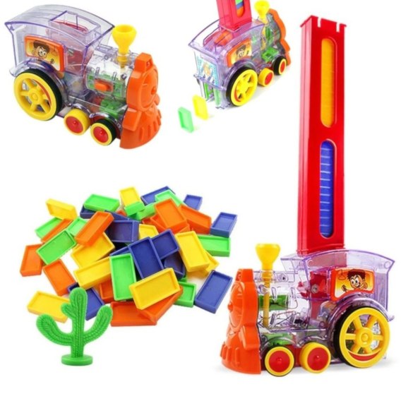Automatyczna lokomotywa domino jeżdżąc układa klocuszki w odpowiednich odległościach. Wystarczy wypełnić podajnik klockami i włączyć lokomotywę. Lokomotywa może jechać do przodu, w lewo bądź prawo. Kierunek jazdy sterowany jest poprzez przekręcenie komina, dzięki temu kształt trasy może być różny na przykład ślimaki, okręgi i ślaczki.