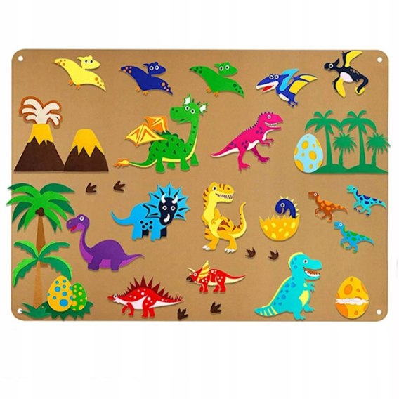 Przedstawiamy zestaw zabawek dinozaurów wykonanych z filcu wraz z dużą tablicą flanelową o wymiarach  104 x 75 cm. Zestaw zawiera 32 wyciętych filcowych figurek dinozaurów z okresu jury, które dzięki samoprzylepnym rzepom łatwo przyczepić do tablicy i tworzyć różnorodne kompozycje.