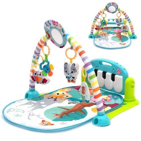 - miejsce do ćwiczenia - gdy dziecko samodzielnie unosi główkę pałąk przepinamy na przód maty. Maluszek, leżąc na brzuszku ma zabawki w zasięgu rączek. Przy poruszaniu nóżkami i uderzaniu nimi w klawisze usłyszymy dźwięki pianinka.