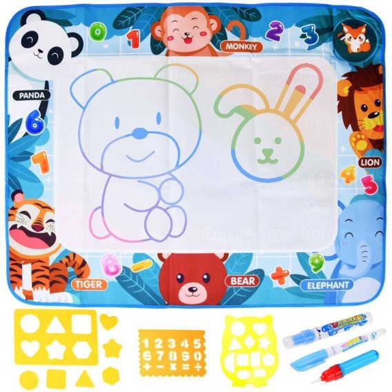 Duża Mata wodna pozwoli każdemu dziecku na tworzenie rysunków, malunków w nieskończoność. Dzięki wodnemu flamastrowi Twoje dziecko będzie mogło rysować, malować do woli! Kolorowa mata wodna w rozmiarze 98 x 78 cm posiada kolorowe tło, które zapewni powstające kolorowe arcydzieło. Obrzeża maty kryją grafikę zwierząt z umieszczonymi ich nazwami w języku angielskim dzięki czemu dziecko będzie mogło przyswajać język angielski podczas zabawy. Zabawa na macie jest totalnie bezpieczna, ponieważ wystarczy nalać do flamastra wodę i zacząć przygodę z rysowaniem, malowaniem, pisaniem. Zestaw został wyposażony dodatkowo w formy do odrysowywania, pędzelek. Z takim zestawem nie ma szans na nudę podczas pochmurnych dni.