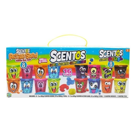- zestaw zawiera: 8 kubeczków z zapachowym piaskiem kinetycznym w różnych kolorach, 8 kubeczków z zapachową ciastoliną w różnych kolorach, 3 foremki i 1 narzędzie do formowania;