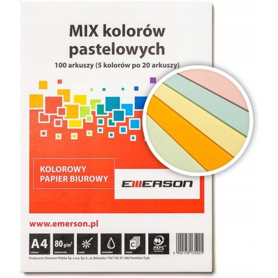 Papier ksero A4 80g mix pastel 100ark Kanarkowy, Różowy, Pomarańczowy, Jasny Niebieski, Jasny Zielony xem1000pwn EMERSON