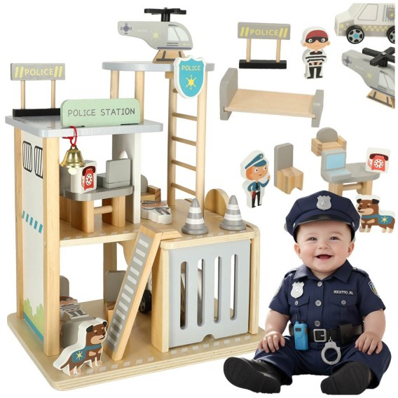 • w całości wykonany z drewna - posterunek policji oraz akcesoria są wykonane z wysokiej jakości drewna, aby Twoje dziecko mogło jak najdłużej cieszyć się zabawką