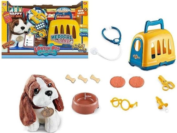 Piesek z klatką do przenoszenia