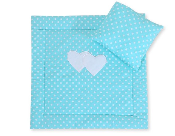 Pościel dla niemowląt z wypełnieniem kołderka i poduszka - Serduszka białe grochy na turkusie