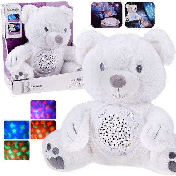 Projektor pluszowy biały miś z efektami dźwiękowymi jako idealny dodatek do pokoju dziecięcego jak również może stać się przytulnym przyjacielem Twojego malucha w każdym momencie dnia i nocy. Pluszowy miś pozwoli uspokoić małe dziecko za pomocą swoich delikatnych, spokojnych melodii. Kolorowe światła tworzące gwiazdy i księżyce wypełnią pokój malucha tworząc prawdziwą krainę snów.