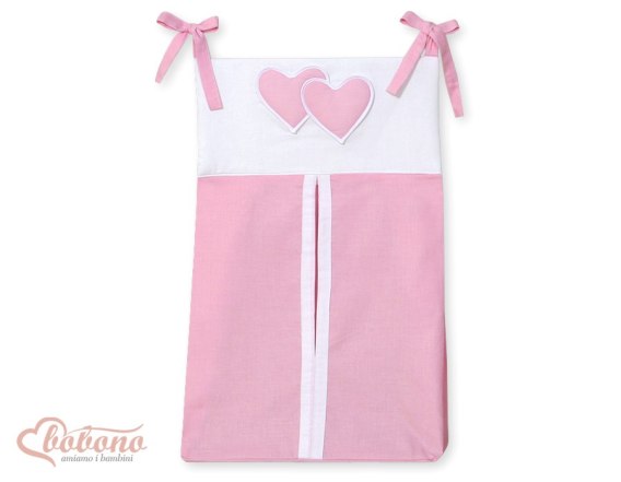 Oryginalny przybornik ułatwiający przechowywanie pieluszek "pod ręką". Przybornik bardzo łatwo przymocować do łóżeczka lub komody. Rozcięcie na przodzie pozwala na łatwe wkładanie lub wyciąganie pampersów. Przód przybornika ozdobiony jest dużymi aplikacjami serduszek. Dno usztywniane.