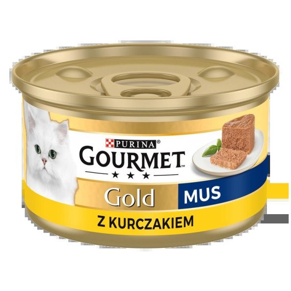 Kompletna karma mokra z kurczakiem w postaci musu przeznaczona dla kotów dorosłych.