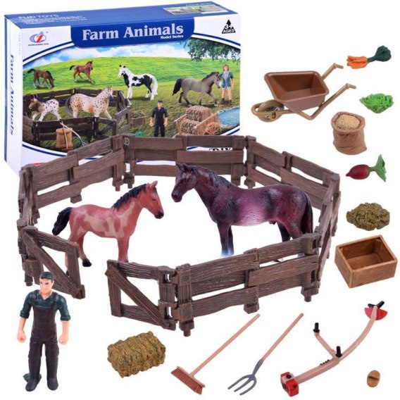Zestaw figurek ręcznie malowanych, zagroda ze zwierzętami, koń konie źrebak farmer, gospodarstwo