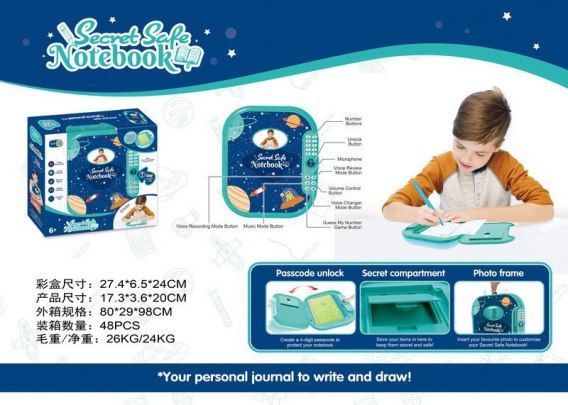 Sekretny notatnik, sejf z zamkiem szyfrowym to propozycja dla dzieci od 3-go roku życia. Zabawka wykonana została z wysokiej jakości tworzywa sztucznego. Wewnątrz sejfu znajduje się notatnik i pisak do pisania sekretnych informacji, oraz ukryta przegródka na ważne drobiazgi. Na przodzie sejfu możemy umieścić w specjalnej przegródce swoje zdjęcie, by jeszcze bardziej spersonalizować swój sejf. Przed pierwszym użyciem notatnika, należy ustawić hasło złożone z czterech cyfr. Zabawka posiada efekty głosowe w języku angielskim. Zasilana jest bateriami typu 3 x AA 1,5V, baterii brak w zestawie.