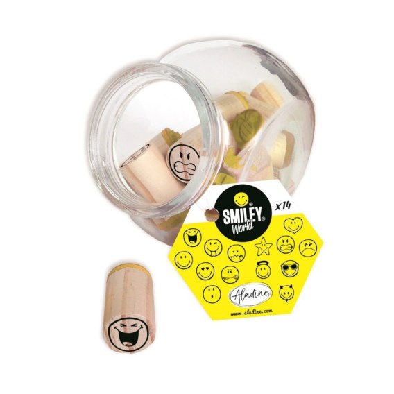 Zestaw 14 gumowych stempelków z drewnianymi rączkami w efektownym szklanym słoju. W zestawie dodatkowo jedna gąbeczka z czarnym tuszem do papieru.