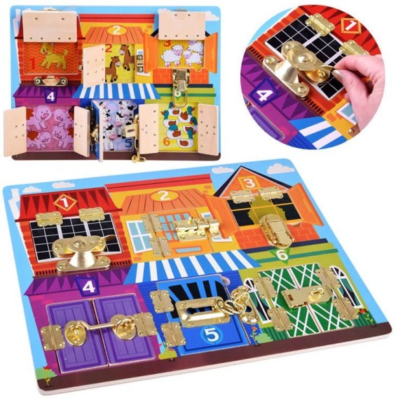 Tablica sensoryczna manipulacyjna dla dzieci, to propozycja dla każdego dziecka. Tablica wyposażona w sześć drzwi zamykanych na zamki. Za każdymi drzwiami na dziecko czeka niespodzianka w postaci zwierzątek. Każdy domek jest ponumerowany cyferką, a dana cyfra odpowiada ilości zwierzątek ukrytych za drzwiami.