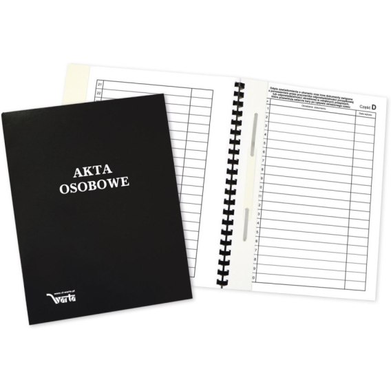 - Zawiera tabele z treścią według wzoru Kodeksu Pracy: - część A - dokumenty zgromadzone w związku z ubieganiem się o zatrudnienie, a także skierowanie na badania i orzeczenia lekarskie; - część B - dokumenty dotyczące nawiązania stosunku pracy oraz przebiegu zatrudnienia pracownika; - część C - dokumenty związane z rozwiązaniem albo wygaśnięciem stosunku pracy; - część D - dokumenty związane z ponoszeniem przez pracownika odpowiedzialności. - część E - dokumenty związane z kontrolą na obecność w organizmie zatrudnionego alkoholu lub narkotyków.