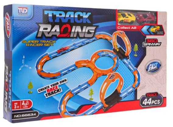 |   | Tor wyścigowy z pętlami 360 stopni, dla dzieci od 3-go roku życia. Tor wykonano z najlepszej jakości plastiku w żywych kolorach. Na zestaw składa się 44 elementów do samodzielnego montażu. Tor posiada odcinki proste do rozpędzenia pojazdu, dwie pętlę 360 stopni i dwa pojazdy. Pojazdy napędzane są napędem pull back. Wystarczy delikatnie nacisnąć pojazd do tyłu, by przejechał tor z pełną mocą.    Funkcje toru: - odpowiedni dla dzieci od 3-go roku życia, - wykonany z najlepszej jakości plastiku w żywych kolorach, - pętle 360 stopni, - pojazdy z napędem pull back. |