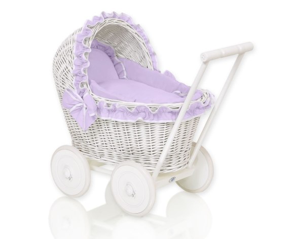 Wiklinowy wózek dla lalek pchacz biały z fioletową pościelką i miękką wyściółką CHIARA