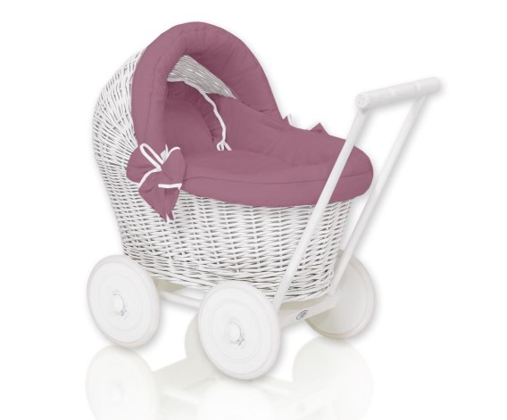 Wózek wyposażono w miękką wyściółkę oraz komplet pościeli – poduszkę i kołderkę z uroczą falbanką i lamówką. Całość dopełniają ozdobne kokardki po bokach oraz miękkie wyłożenie wokół budki i gondoli wózka, które nadają bajkowy wygląd. Całość pomalowana na biało ekologicznymi farbami.