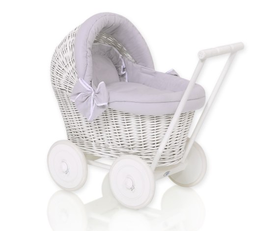 Wiklinowy wózek dla lalek pchacz biały z szarą pościelką i miękką wyściółką