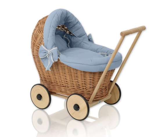 Wiklinowy wózek dla lalek z pościelką – ręcznie robiony pchacz z naturalnych materiałów