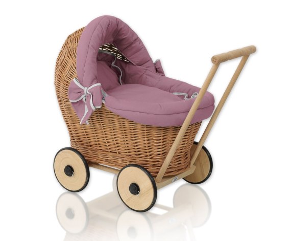 Wiklinowy wózek dla lalek pchacz z pościelką róż retro i miękką wyściółką STELLA - naturalny