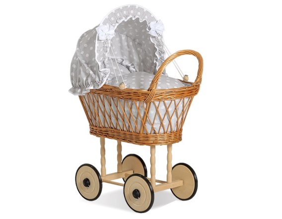 Wiklinowy wózek dla lalek - z naturalnej wikliny, na naturalnym wysokim drewnianym podwoziu z drewnianymi kółkami.