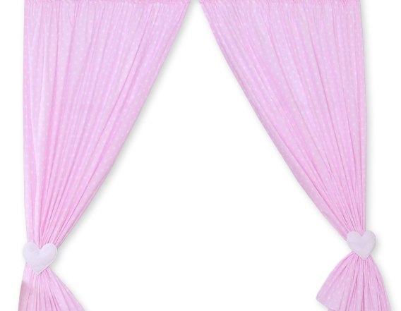Piękny komplet zasłonek z serduszkami i szarfami do związania po bokach. Wykonane z tkaniny bawełnianej. Góra zasłonek obszyta taśmą do łatwego i równego zmarszczenia. Idealnie uzupełniają pokój dziecięcy tworząc harmonijną całość z pościelą na łóżeczku.