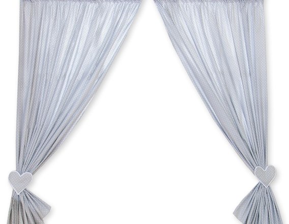 Piękny komplet zasłonek z serduszkami i szarfami do związania po bokach. Wykonane z tkaniny bawełnianej. Góra zasłonek obszyta taśmą do łatwego i równego zmarszczenia. Idealnie uzupełniają pokój dziecięcy tworząc harmonijną całość z pościelą na łóżeczku.